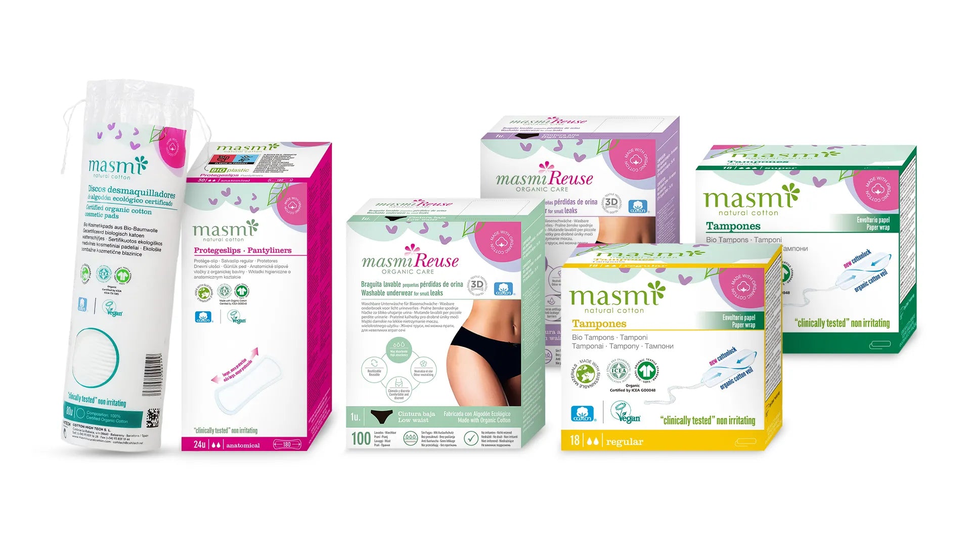 MASMI NATURAL COTTON besteht aus einer breiten Palette natürlicher Intimpflegeprodukte, hergestellt aus 100% reiner Baumwolle oder Bio-Baumwolle, die die Haut pflegen und unsere Umwelt schützen.